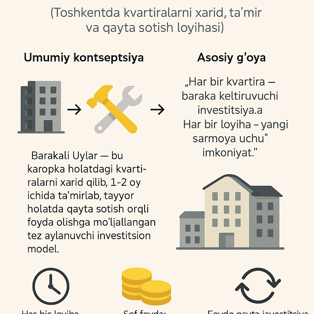 “Barakali Uylar” — Toshkentdagi flipping (xarid–ta’mir–sotuv) loyihalarini shaffof, tez va raqamli boshqaruv orqali barakali investitsiyaga aylantiradi.