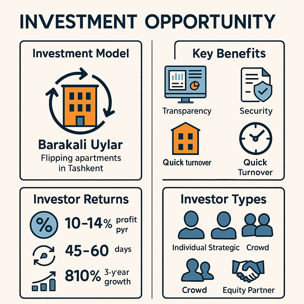 “Barakali Uylar” — bu flipping biznesini real aktiv, tez aylanuvchi va raqamli investitsion modelga aylantirgan platforma.Siz kiritgan har bir dollar real kvartira, real foyda va real tizim bilan kafolatlangan.ERP tizimi, professional jamoa va shaffof hujjatlar orqali xavfsiz va tez aylanadigan investitsiya modeli yaratilgan.3 yilda sizning sarmoyangiz:�� 100 000 $ → 910 000 $ (+810%)�� Har siklda 10–14% foyda�� Har 45–60 kunda to‘liq aylanish